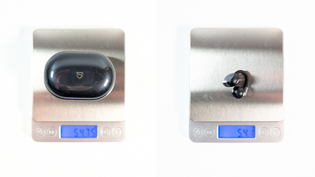 サイズは大まかに縦4.5cm、横7cm、高さ3.5cmといった所。重量はイヤホン込のケースが約55g、イヤホン本体が片耳約5.4gでした。